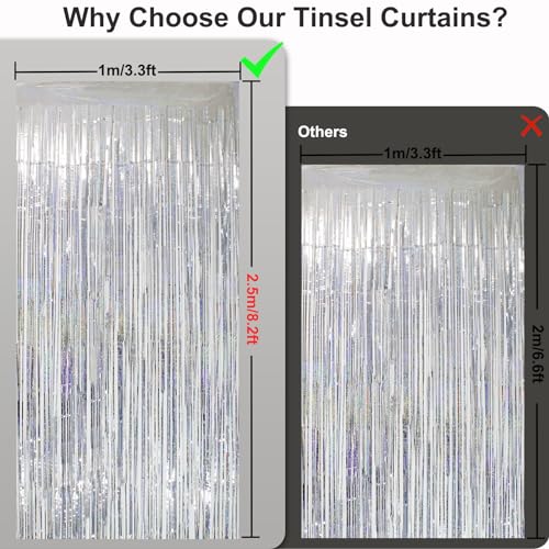 - Versatile and Dramatic: These 2 pieces of (3.3ft x 8.2ft) 100cm x 250cm tinsel curtains can be hung separately in different locations, or doubled up for a fuller and more dramatic effect. The choice is yours in creating the perfect backdrop for birthdays, baby showers, bachelorette parties, graduations, and holidays.