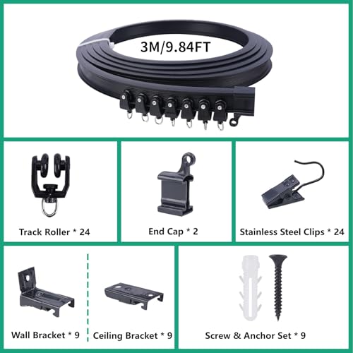 • Curtain Track and Accessories Included: 1 x 3-metre-long bendable curtain track, 24 track gliders, 9 clip-on ceiling/wall brackets, 9 screws and nuts, 2 end caps, and 24 serrated metal clips. No additional accessories are required, as the included components are sufficient to meet your installation needs, saving you time and costs.