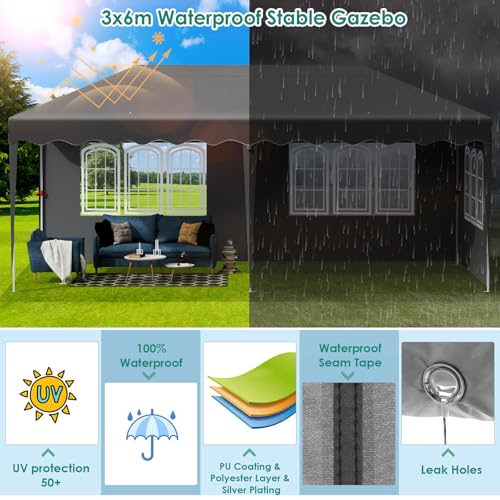 - EASY TO SET UP AND TRANSPORT: The folding gazebo can be assembled and disassembled in just a few minutes with the help of two people. In addition to the 3×6 waterproof gazebo, you can remove the side walls of the party tent for enhanced privacy and shade. Weighing only 26.7 kg, it conveniently fits into the included carrying bag, making it easy to transport in your vehicle.