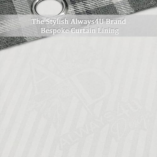 always4u 100% Blackout Curtains Check Eyelet Curtain Bedroom Plaid Woven Brushed Cheque Pair of Highland Woolen Look Window Treatment for Living Room Grey 46 * 90 Inches