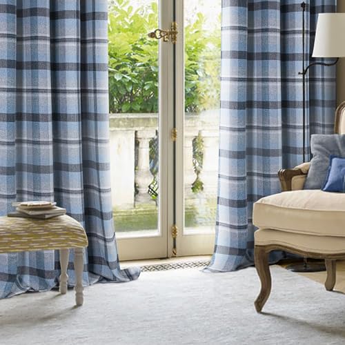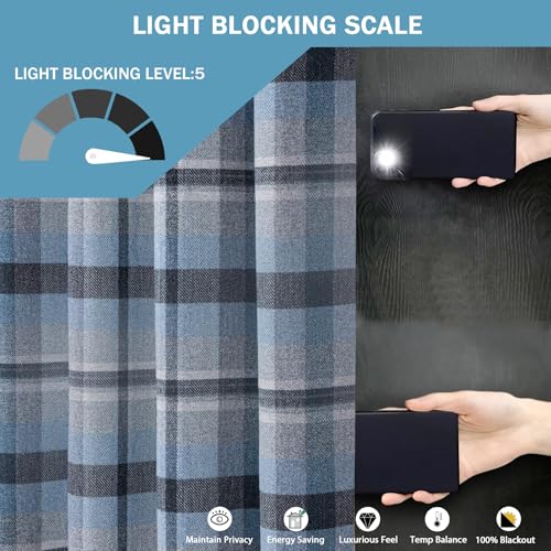 always4u Woolen Look Check Curtains 100% Blackout Highland Tartan Curtain for Living Room Bedroom Grommet Lined Window Drapes 2 Panels Light Blue 54 * 63 Inches