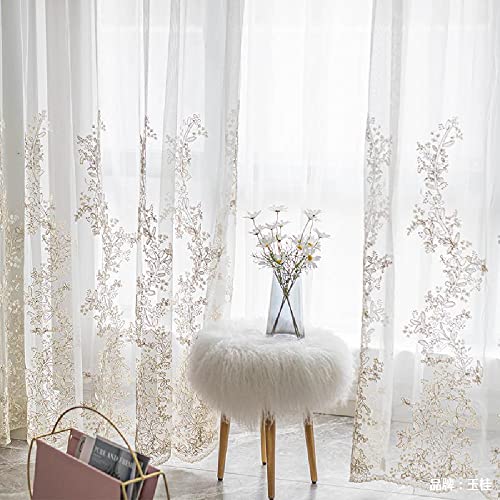 Amidoudou Pencil Pleat Curtains 1 Pair Luxury Embroidered Tulle Curtains for Living Room Wedding 3D Gold Flower Sheer Curtains (White,66 x 90 Inch)