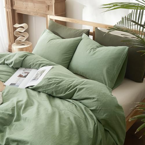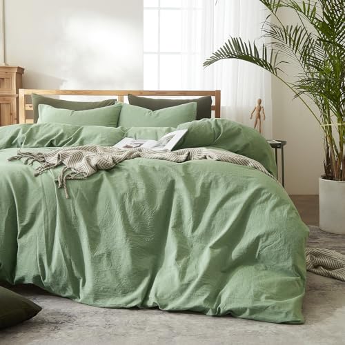 AMWAN Modern Style Sage Green Duvet Cover Queen Size 100% Washed Cotton Light Bedding Sets Hotel Quality Solid Color Comforter 1 with 2 Pillowcases Set, Full/Queen(90''x90'')