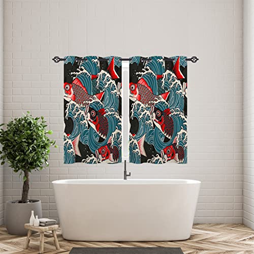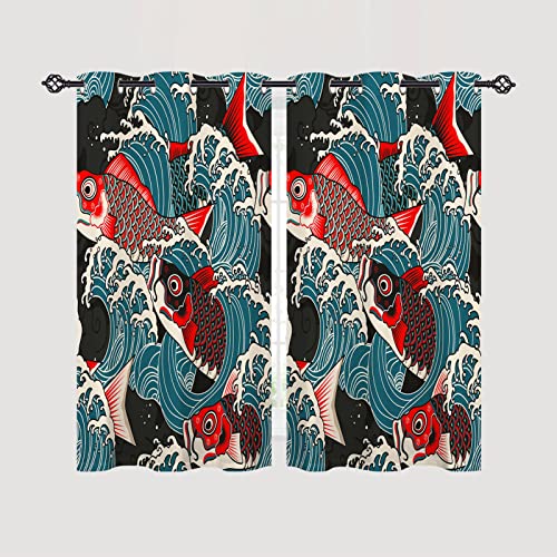 ANHOPE Japanese Curtains Eyelet 80% Blackout Room Darkening Curtains with Colored Koi Carp Fish Ocean Wave Print Pattern Light Blocking Window Drapes for Bedroom Living Room 28 x 54 Inch Drop 2 Panels