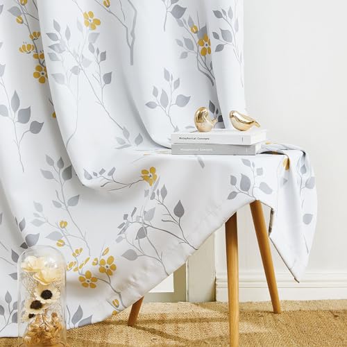 Beauoop Yellow Grey Floral Blackout Curtains for Bedroom Living Room 72 Inch Drop Leaf Print Eyelet Curtain Botanical Thermal Insulated Noise Reducing Drapes Window Treatment Sets 2 Panels