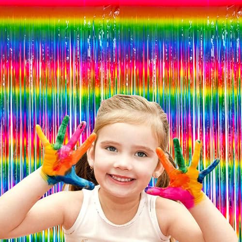 BEISHIDA 2 Pack Dark Rainbow Colorful Foil Fringe Curtain, Assort Color Tinsel Metallic Curtains Photo Backdrop for Birthday Party Wedding Engagement Bridal Shower