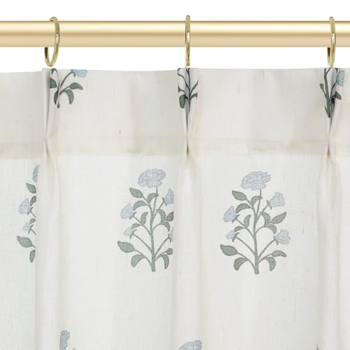 Cafe Curtains 30 Inch Length,Pinch Pleated Farmhouse Linen Sheer Blue and Green Floral Cute Boho Block Print Half Curtains for Small Window