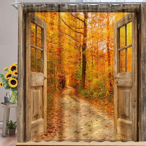 Boho Fall Forest Shower Curtain, Autumn Nature Jungle Woodland Maple Leaves Tree Shower Curtain Set, Rustic Barn Door Fabric Farmhouse Cabin Shower Curtain for Bathroom 12 Hooks, 72×72 Orange Yellow
