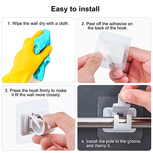 • Easy to install:1. Wipe the wall dry with a cloth, do not have water marks, or it may fall off easily. 2. Peel off the adhesive on the back of the hook. 3. Press the hook firmly to make it fit the wall more closely. 4. Install the pole to the recess and clamp it