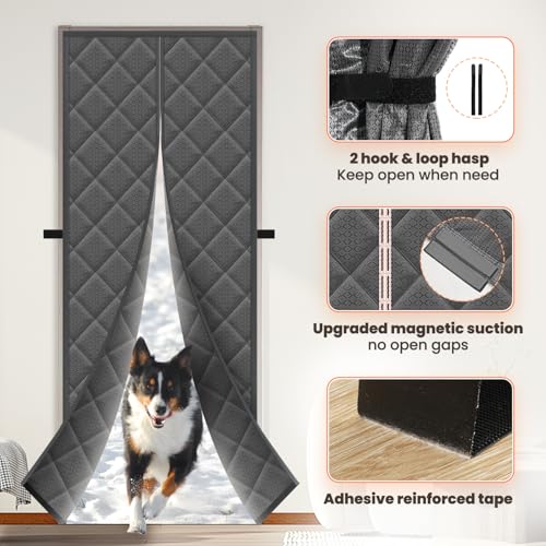 Calanofin Magnetic Thermal Insulated Door Curtain Fits Door Size 36" x 80", Strong Magnets Door Screen Insulation with Thicken Cotton Doorway Curtains Window Insulation Kit for Winter – Grey