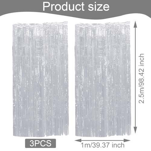 CIGTSICO 3PCS Foil Backdrop Curtain, 3.2ft x 8.2ft Silver Fringe Curtain Tinsel Backdrop Glitter Photo Props for Valentines Decorations Birthday Wedding Engagement Party Decorations (Silver)