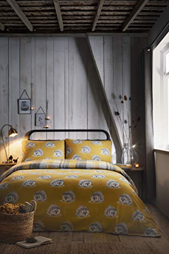 Dreams & Drapes – Ochre Checkered Hedgehog Duvet Cover – Double Bedding Size (200 x 200cm) – Soft 100% Brushed Cotton – Reversible Design – Ochre Yellow Flannelette Woodland Bedding with Hedgehogs