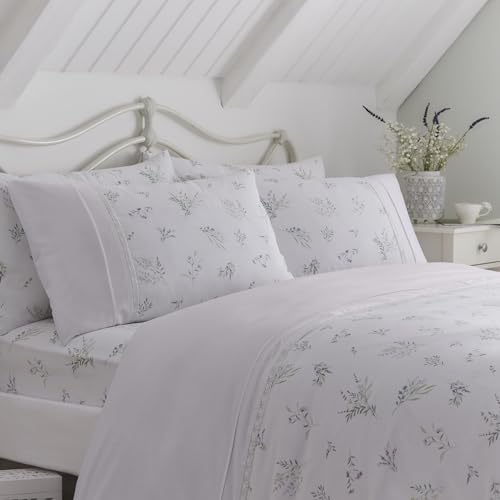 Dreams & Drapes White & Lavender Floral Duvet Cover – Single 140x200cm – Vintage Botanical Print – Ruffle & Lace Trim – Soft Polycotton Bedding Set with Pillowcase – Classic Cottage Style