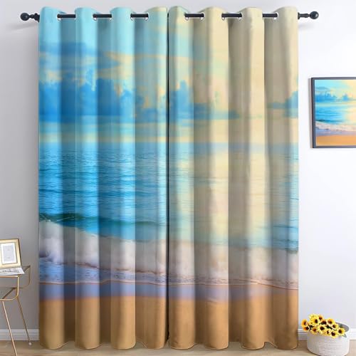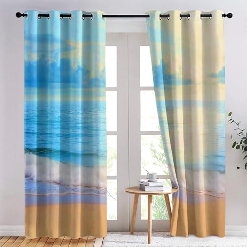 Eyelet Curtains Blackout, 29.5 x 65 Inch Thermal Insulated Energy Saving Natural Landscape 90 Drop Super Soft Darkening Curtains Beach Waves Sunset for Bedroom Living Dining Room, 2 Panels