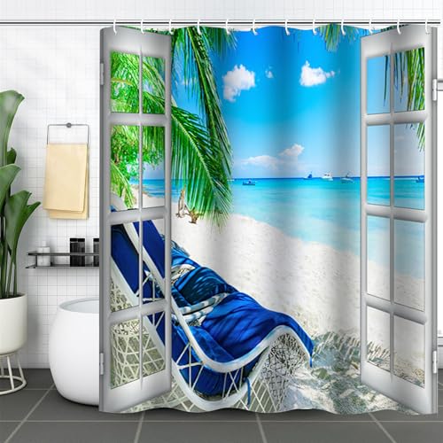 FAIRYGATE Beach Shower Curtain Palm Tree Decor Ocean Beach Seascape Through White Wooden Windows Summer Scene Tropical Island Blue Green Waterproof Bathroom Decor Set with Hooks B8816