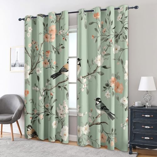Floral Bird Curtains for Bedroom Living Room, Sage Green Country Flower Blackout Curtains 90×90 Inch, Eyelet Thermal Drapes Window Treatments, 2 Panels Bsy39