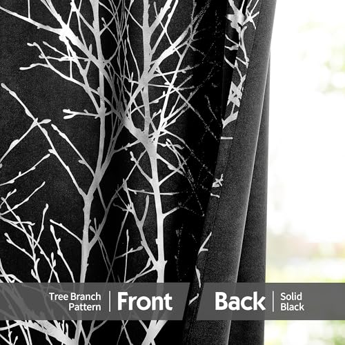 Fmfunctex Black Silver Blackout Curtains for Living Room 90 inch Drop Eyelet Curtains for Bedroom Tree Branch Foil Thermal Insulated Window Curtain Panels 2 Panels