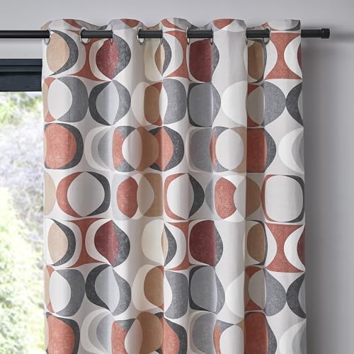 Fusion Spice Orange Retro Eyelet Curtains W66 x L54 (168x137cm) – 2 Panels – 100% Cotton Geometric Drapes in Terracotta – Crescent Collection – Bedroom/Living Room Window Decor