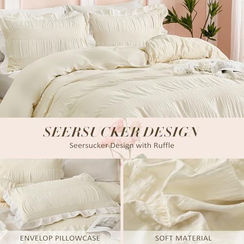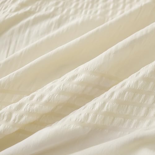 Guchuang Bedding Cream White Seersucker Duvet Cover Set Double Size, Ruffled Trim 3-Piece Microfiber Bedding Set – Wrinkle-Resistant & Lightweight Design with Hidden Zipper (Double, 200x200cm)