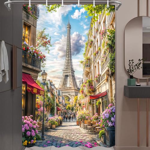 - 3. Versatile Decor: Our Paris Eiffel Tower Shower Curtain seamlessly blends retro city landscape elements with floral street town motifs, making it an ideal choice for various decor styles, from modern to classic.