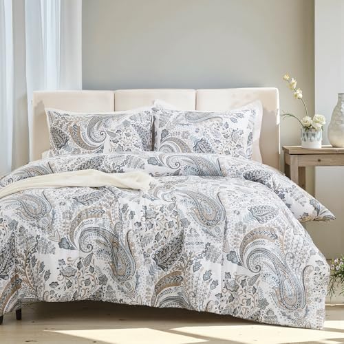 Herside 100% Cotton Bedding Set Soft Grey Paisley Duvet Cover Set Super King Shabby Chic Pattern 3 Pcs with Pillowcases All Season Boho Floral Bedding Cover