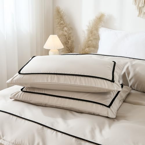 - PREMIUM DESIGN: This 2-piece duvet cover set features a classic taupe color palette, complemented by elegant black pom-pom piping trim. The design exudes a countryside charm, blending rustic appeal with a touch of modern sophistication, making it a versatile addition to any bedroom decor.
