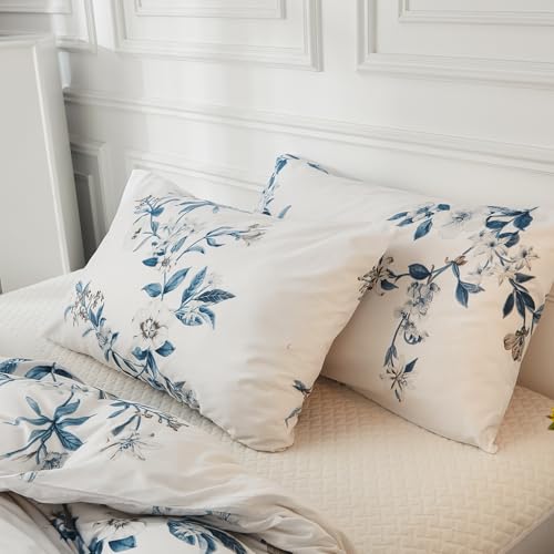 Herside Blue Flowers Duvet Cover Set Double White Blue Bedding Flowers Printed Pastoral Style Bedding Sets 1 Microfiber Quilt Cover 2 Pillowcases (Blue, Double)