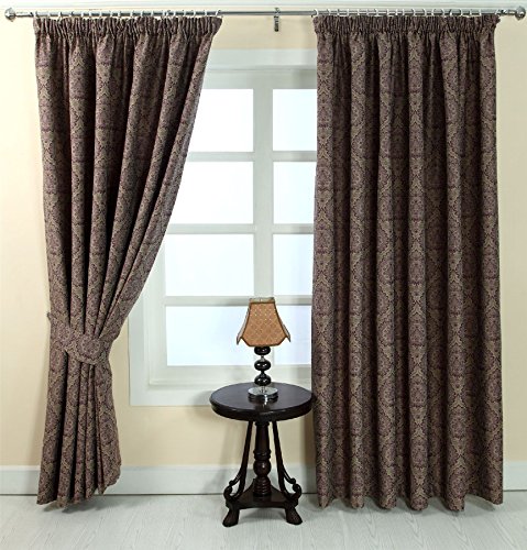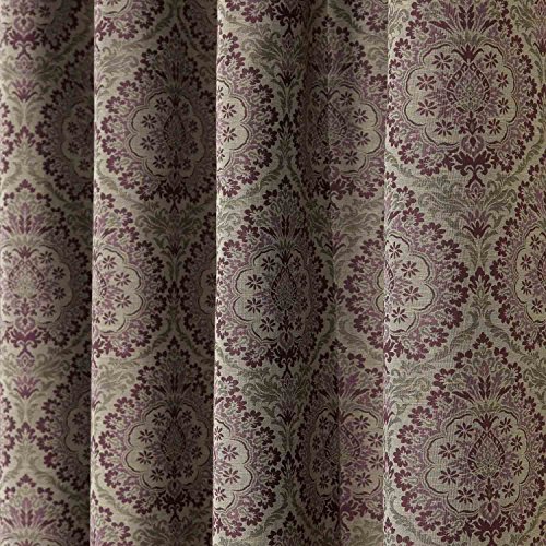 HOMESCAPES Aubergine Purple Jacquard Pencil Pleat Curtain Pair Damask Leaf Motif Design – Width 228 x Drop 137 cm (90 x 54 Inch)