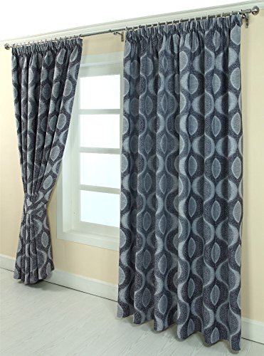 HOMESCAPES Blue Patterned Pencil Pleat Curtain Pair, Contemporary Style Circular Swirl Design Tie Backs Included – Width 167 x Drop 228 cm (66 x 90 Inch)