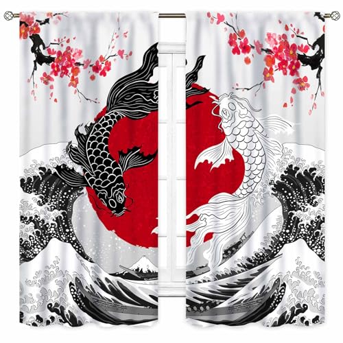 Japanese Curtains, Asian Style Japanese Anime Black White Yin Yang Koi Fish Cherry Blossom Great Wave Oriental Window Drapery Treatments for Bedroom Living Room Kitchen Bathroom 2 Panels, 42"x45" Inch