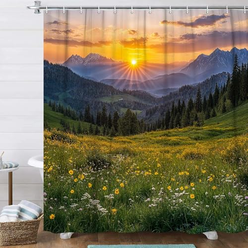 JAWO Forest Shower Curtains for Bathroom, Nature Woodland Flower Mountain Scenery Home Decor Rustic Farmhouse Bath Curtains 69×70 Inches