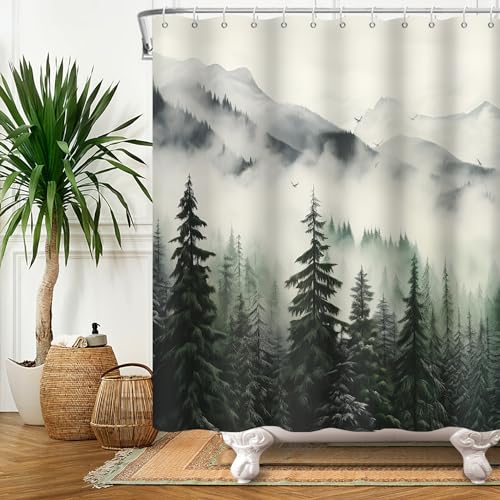 Kzzfqxb 183x213cm Foggy Shower Curtains with Hooks, White Mist Mountains Pine Trees Forest Woodland Landscape Scenery Occluded Waterproof for Bath, Polyester Fabric Bathroom Bathtub Nature Decor