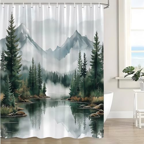 LAEDCIITI Green Misty Forest Shower Curtain Mountain Foggy Pine Trees Landscape Watercolor Jungle Plant Rustic Nature Scenery Lake Fabric Bathroom Curtain Set with Hook