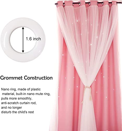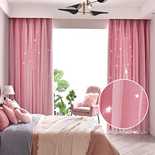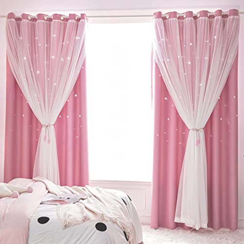 Lanqinglv Star Blackout Curtains with Nets,Pink Star Panels Nursery Double Layer Window Curtains for Kids Girls Room Bedroom Living Room Decoration,2 Panels,W 52 in x L 96 in