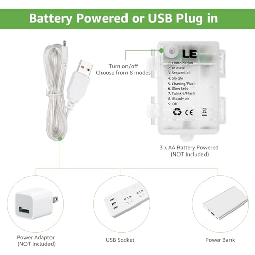 These Lepro curtain lights can be powered by USB plug or 3 AA batteries (not included), suitable for indoor and outdoor decorations, like birthday, wedding, bedroom, Christmas, etc.