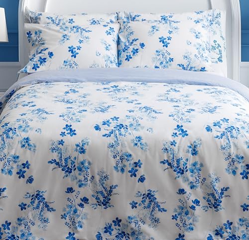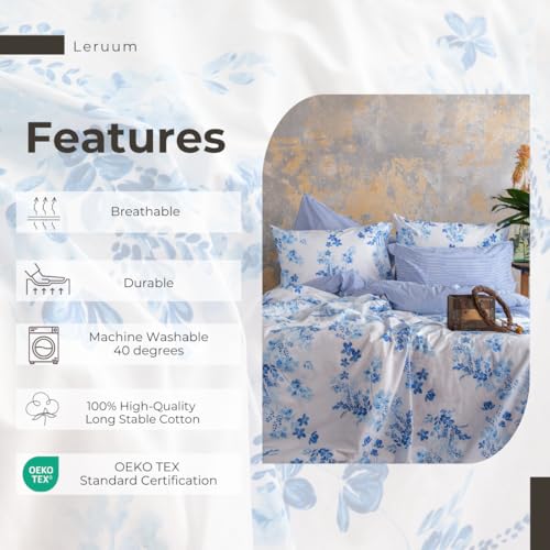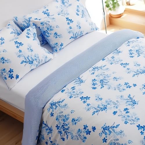 - REVERSIBLE WHITE DUVET COVER SET WITH BLUE FLOWERS & STRIPES: Bring the magic of the all season into your bedroom with this reversible duvet cover bedding set. Perfect for adding a cosy winter touch to your decor, this high-quality set features a stunning floral print with blue flowers on a crisp white background on one side and blue stripes on the other, allowing various combinations. Made from 100% premium cotton, this set ensures comfort and elegance all season long. Thoughtfully crafted and gift-ready, it's an ideal gift.