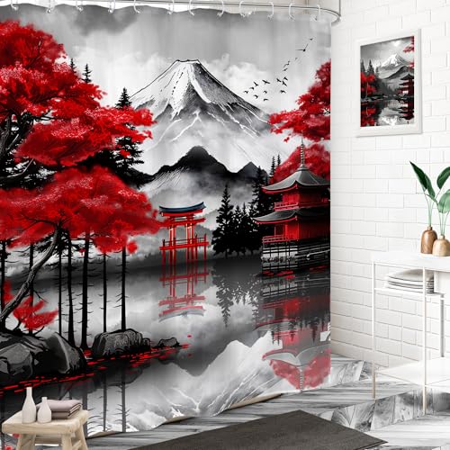 LIGHTINHOME Japanese Cherry Blossom Shower Curtain 60Wx72H Inches Black Red Asian Mountain Lake Vintage Anime Nature Woodland Cloth Fabric Waterproof Polyester Bathroom Home Decor Set with Hooks
