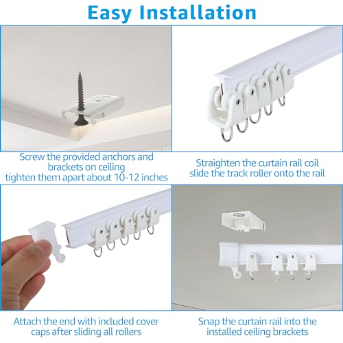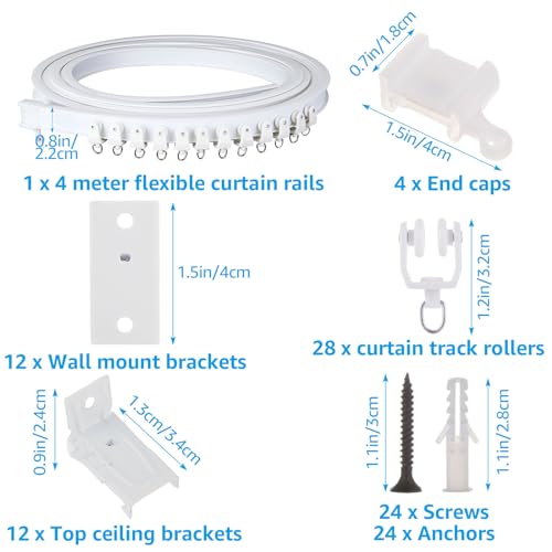 • Curtain Rails and Fittings Set: The package included 1 pcs 4 meter ceiling curtain track, components contains 28 x curtain track rollers, 12 x snap on ceiling brackets, 12 x snap on side brackets, 4 x end covers, 24 x screws and anchors.