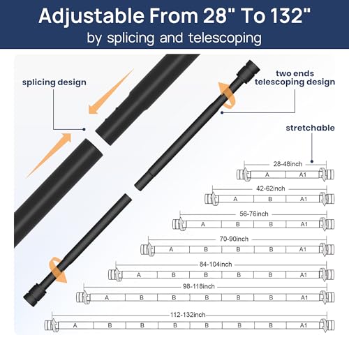 - Easy To Assemble Curtain Rod Set: This 28" to 132" curtain rod set includes 2 telescopic rods and 6 splicing rods for versatile length configuration. The improved connection design ensures smooth assembly and effortless curtain movement without thread alignment hassle.