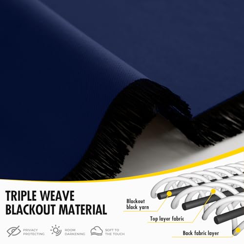 - These super-soft and durable curtains use a special triple weaving technology. Black yarns are woven between the two coloured threads to ensure that the curtains provide at least 80% shading capacity (darker coloured curtains work better). You will receive two pieces of navy blackout curtains, each 90 inches drop and 46 inches wide, the total width of the two curtains laid flat is 92 inches. The curtain length indicated on the page includes the eyelet part