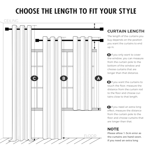 - Our blackout curtains are the same colour on both sides. Choosing the right size curtains for your windows is crucial, and it starts with accurate measurement. First, measure the width of your window. We recommend that you choose curtains whose total width is at least twice that of the window to achieve a beautiful pleated effect. For the length, measure from the curtain rod to where you want the curtain to end. And choose curtains that are longer than this distance
