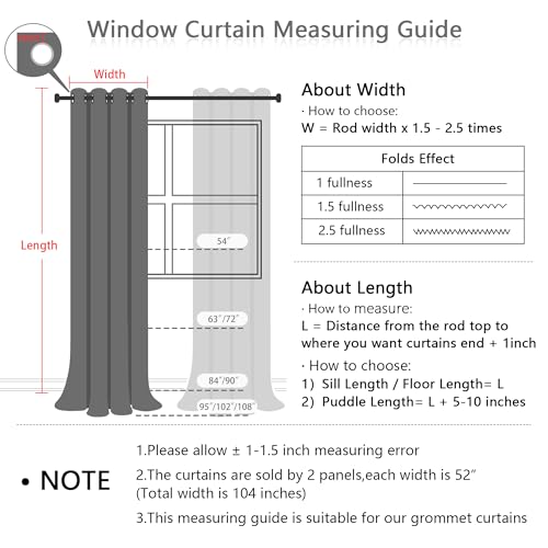 - Product Information: Includes 2 curtain panels, Each panel measures 52" W x 84" L | Set measures 104" W x 84" L, and each curtain has 8 premium anti-rust grommets on the top