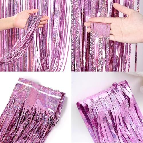 OEMG 4 Pack 3.3×8.2ft Tinsel Foil Fringe Curtains Pink Glitter Laser Streamers Backdrop for Kids Girl Birthday Halloween Christmas Pamper Wedding lol Party Decorations