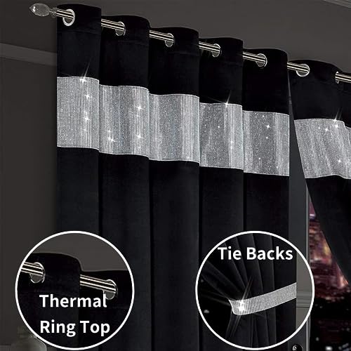 Olivia Rocco Diamante Blackout Eyelet Curtains With Tie Backs Black Out Thermal Ring Top Curtain Pair Window Dressing, 66" (Width) x 90" (Drop) Black