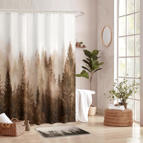 ORTIGIA Brown Misty Forest Shower Curtain for Bathroom, Nature Woodland Shower Curtain Set with Hooks, Decorative Pine Tree Fog Magic Bath Curtain for Home, 72×72