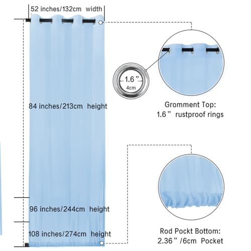 - Package Included: Includes 2 Panels outdoor sheer curtains. Each panel measures 100" wide x 120" length. These sheer curtains are crafted from weave polyester voile fabric, not only appears an elegant look without wrinkles but also adds a soft touch.