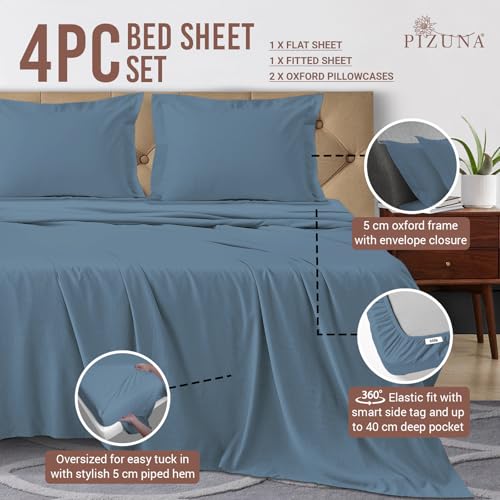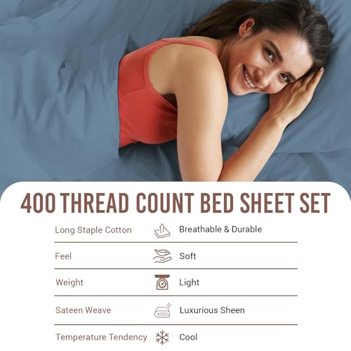 Pizuna 100% Cotton King Size Sheet Set Dusty Blue, 400 Thead Count Long Staple Cotton Bedding Set 275×280 cm, Soft Sateen 4 PC King Bed Sheet Set -Fitted Sheet, Flat Sheet & 2 Pillowcases