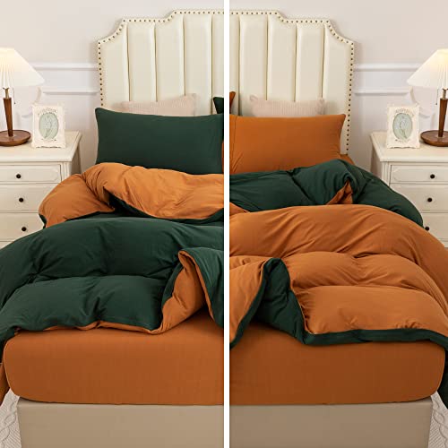 PURE ERA Jersey Knit Duvet Cover Set 100% T-Shirt Cotton Super Soft Comfy 3pc Bedding Set with Zipper Closure (Solid Forest Green/Burnt Orange, Queen)