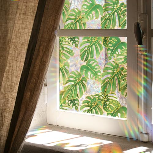 Runtoo Rainbow Palm Leaves Privacy Film – 3D Decorative Vinyl Stained Glass Plant Leaf Clings, Static Window Decals, Non-Adhesive Sticker, 15.75 x 40 Inches