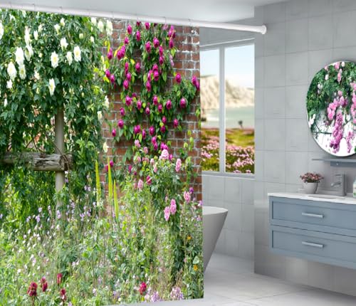 SCVBLJS Floral Shower Curtain Waterproof Bathroom Bathtub Polyester Fabric BathroomFlower Shower Curtain Scenery flower leaves curtain Garden Home green curtain With Hooks 180X180cm